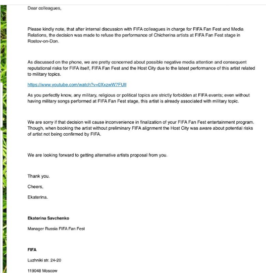 L’on apprend ainsi que la FIFA a discuté du cas de Chicherina, c’est en tout cas ce qu’affirme Ekaterina Savchenko, et qu’il est impossible que la chanteuse ne se produise devant les fans à Rostov sur le Don, puisque la FIFA exclue toute chanson politique, religieuse ou militaire. Or, même si Chicherina ne chante pas une chanson militaire, son répertoire et sa réputation pourraient porter atteinte à l’image de la FIFA et provoquer une attention négative des médias, puisqu’elle est déjà associée à la thématique militaire.