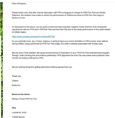 La chanteuse de rock russe Julia Chicherina vient de recevoir une lettre de la FIFA, en anglais, qui ne lui est pas nommément adressée, mais qui la concerne et qu’elle a publié sur sa page Facebook: